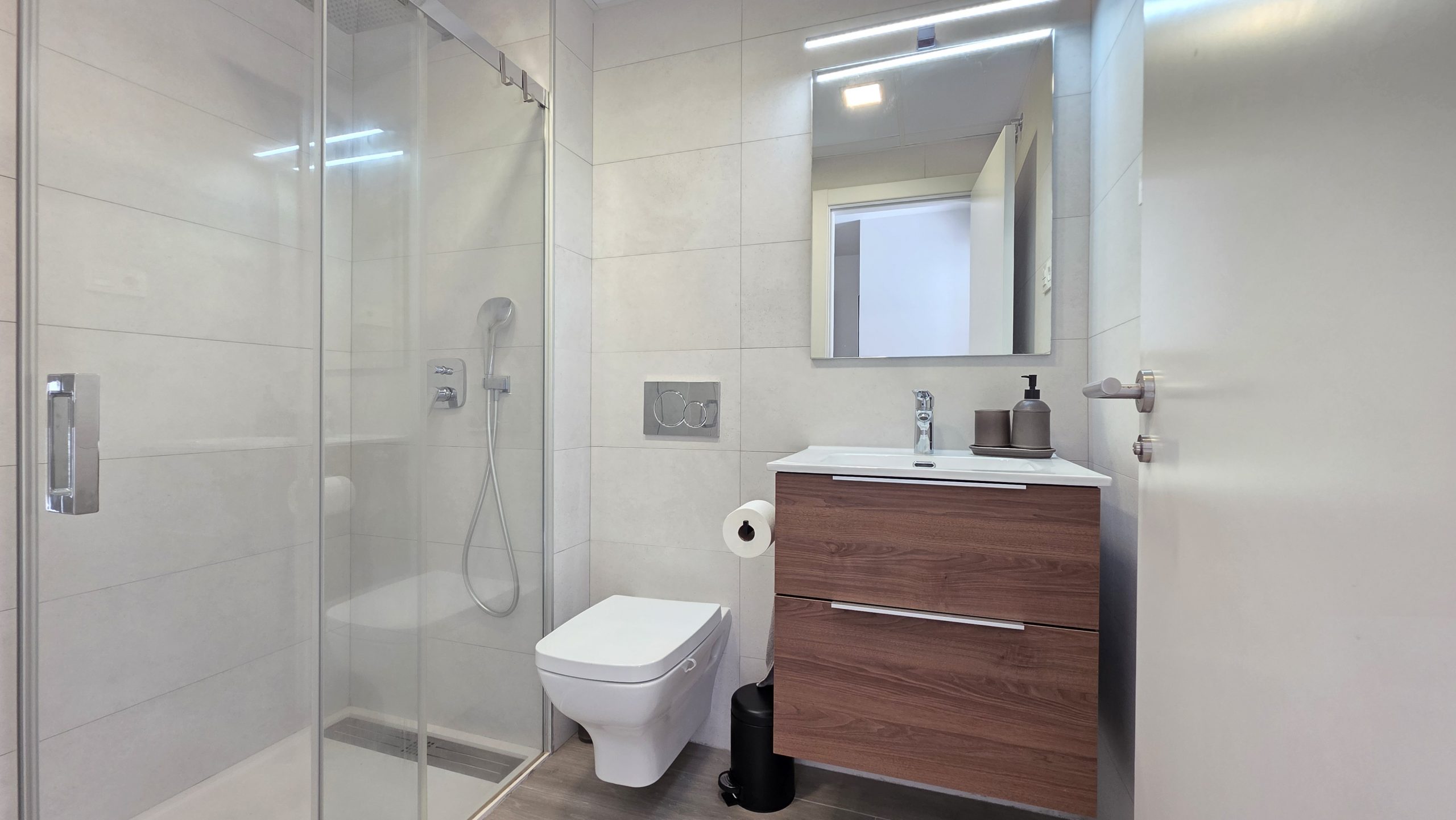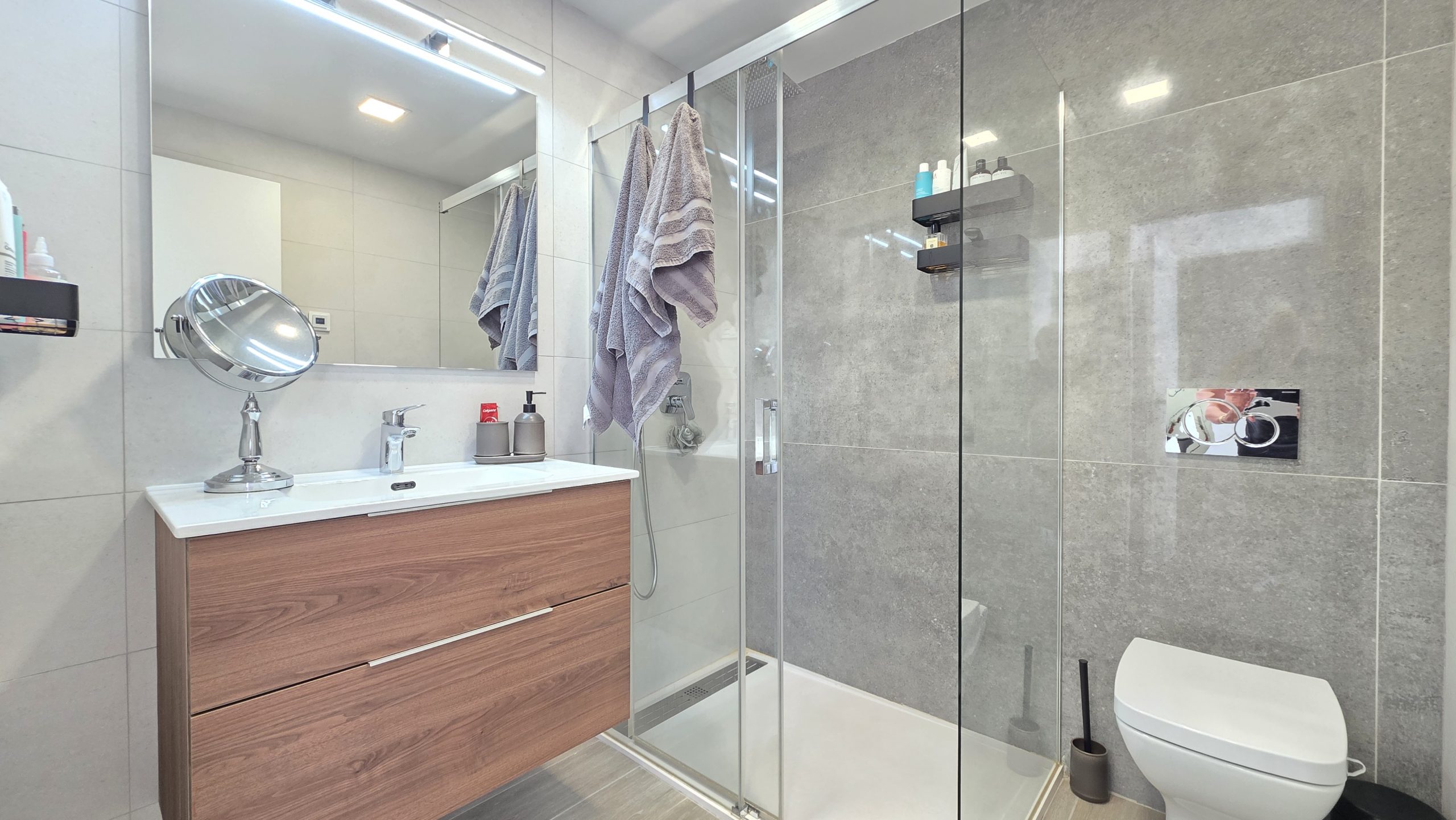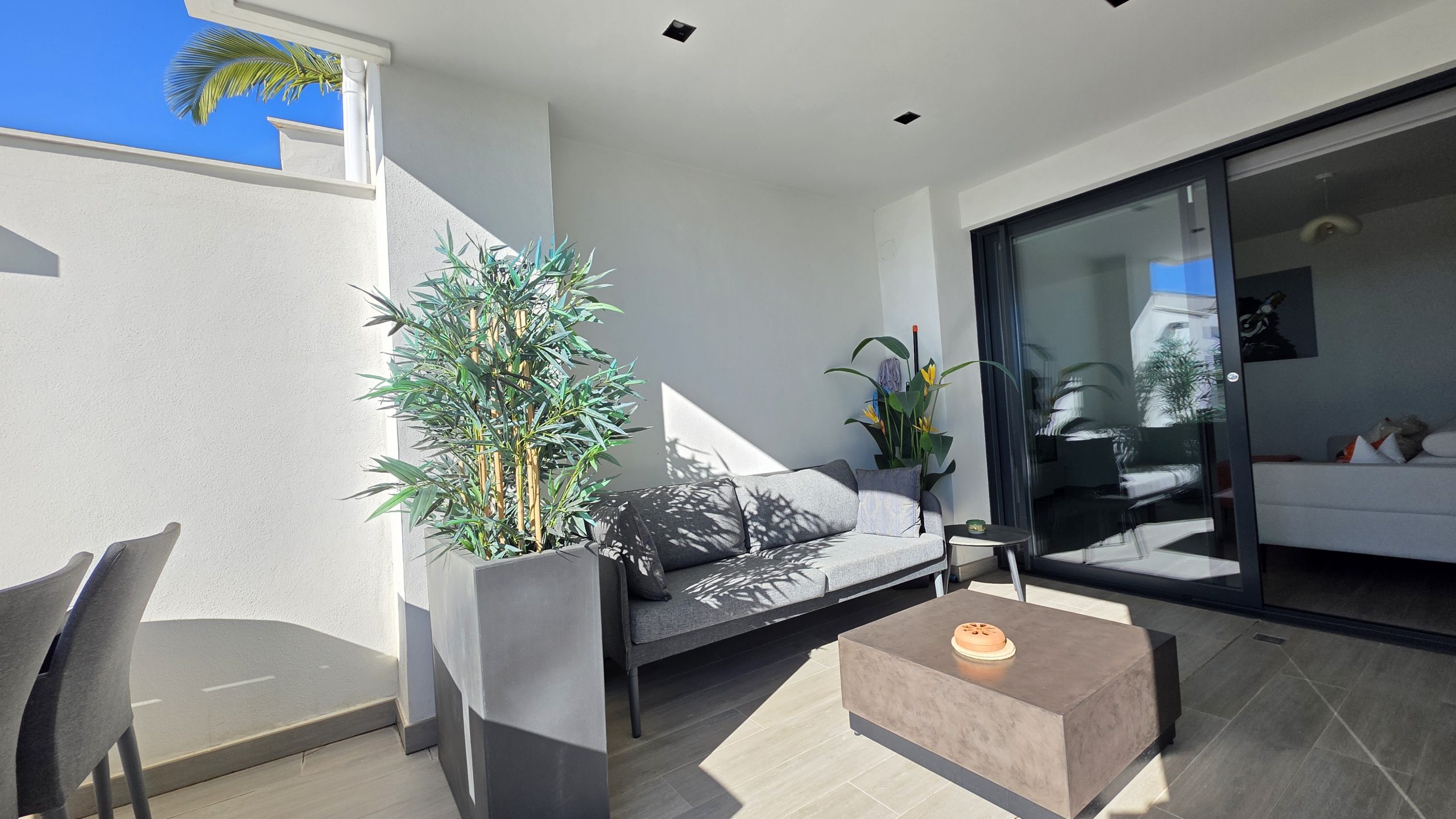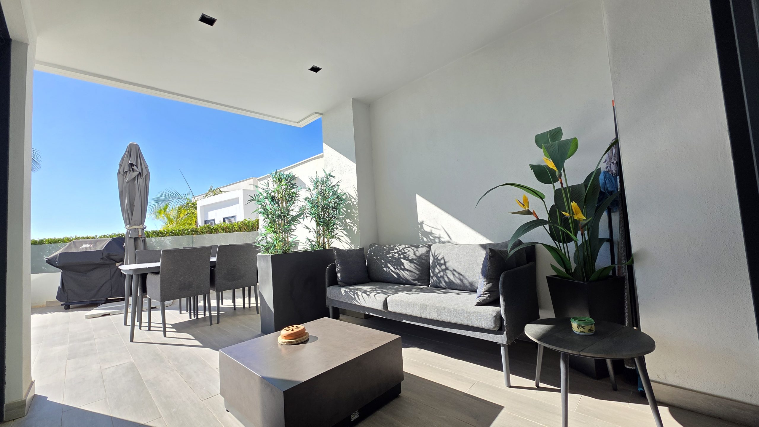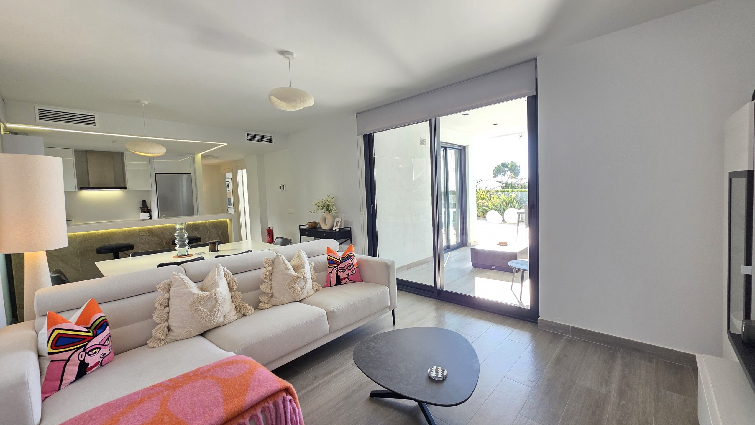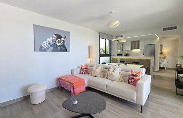 El apartamento cuenta con tres dormitorios confortables y dos baños de estilo contemporáneo, uno de ellos en suite. Tanto el salón como dos de los dormitorios ofrecen acceso directo a una amplia terraza, un espacio ideal para disfrutar del sol, del estilo de vida al aire libre y de momentos de relajación junto a familiares o amigos.