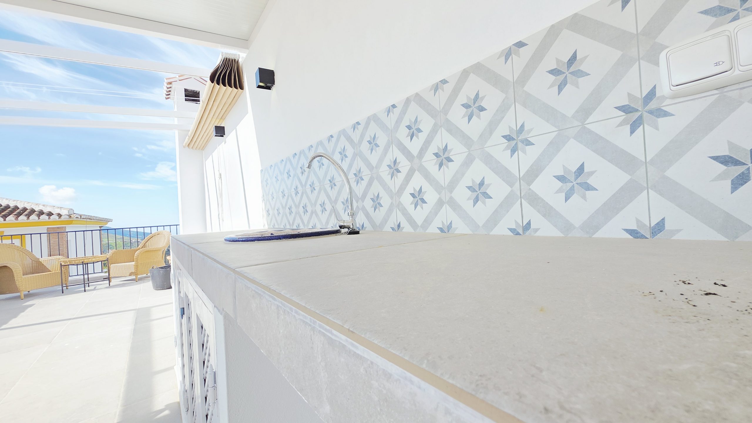 En el exterior hay varios espacios agradables para disfrutar del clima andaluz. La casa cuenta con un patio, una terraza con pequeña cocina de verano y una azotea con bonitas vistas al mar y al pueblo de Cómpeta. En la azotea existe además la posibilidad de instalar un jacuzzi, creando así un espacio privado ideal para relajarse.