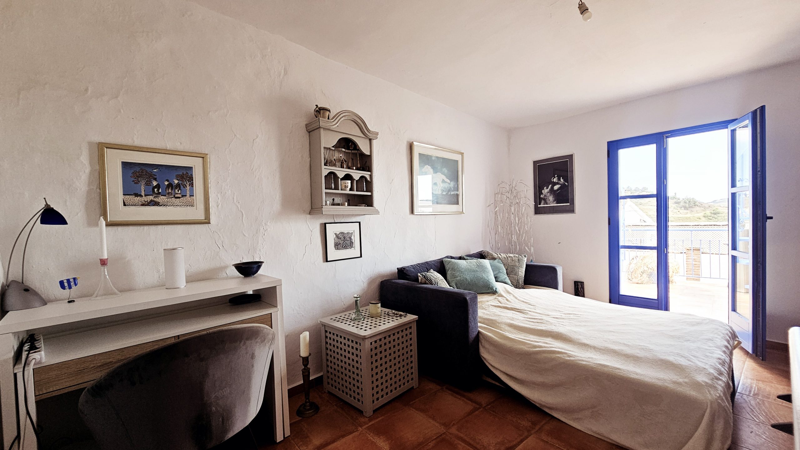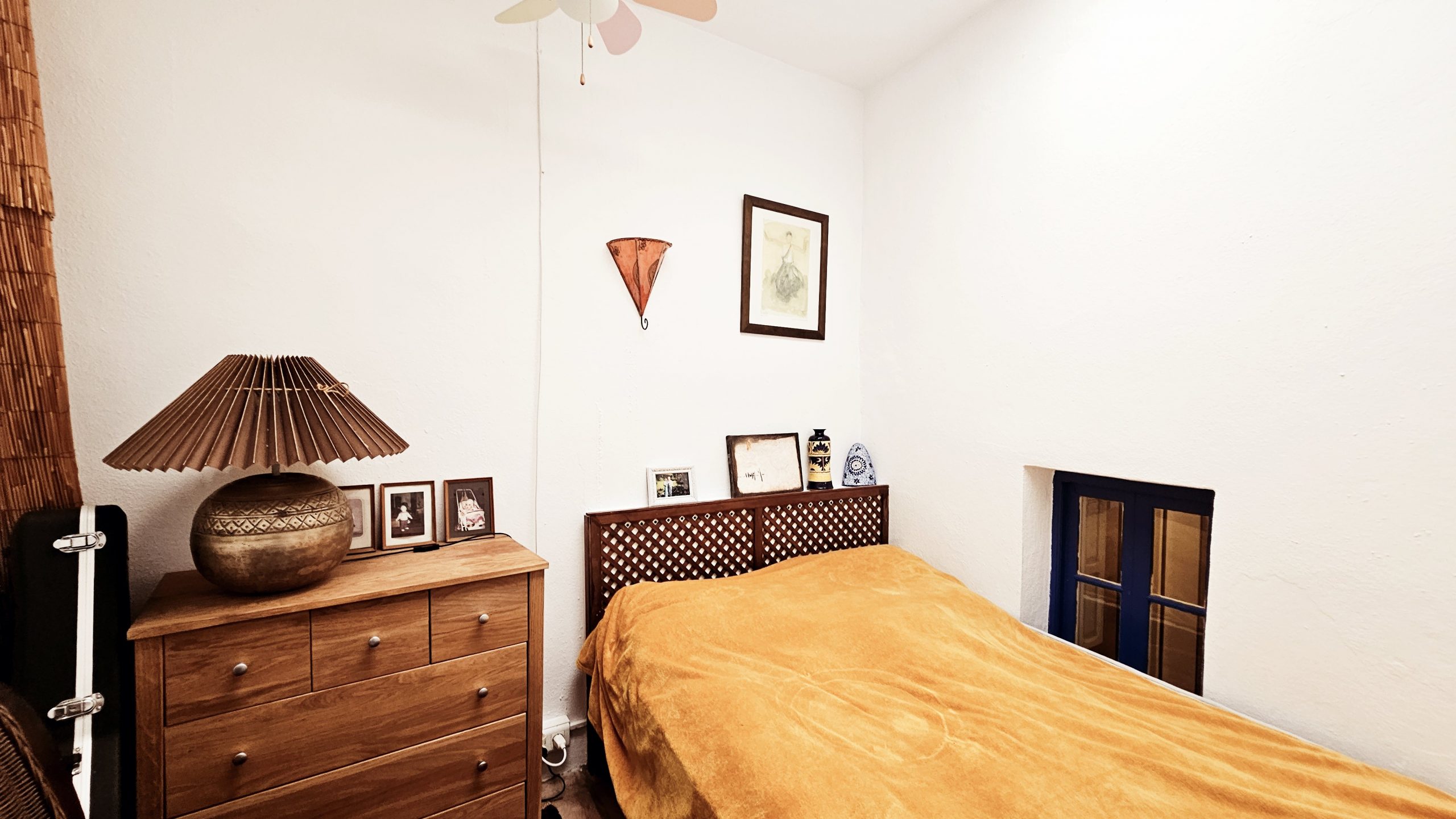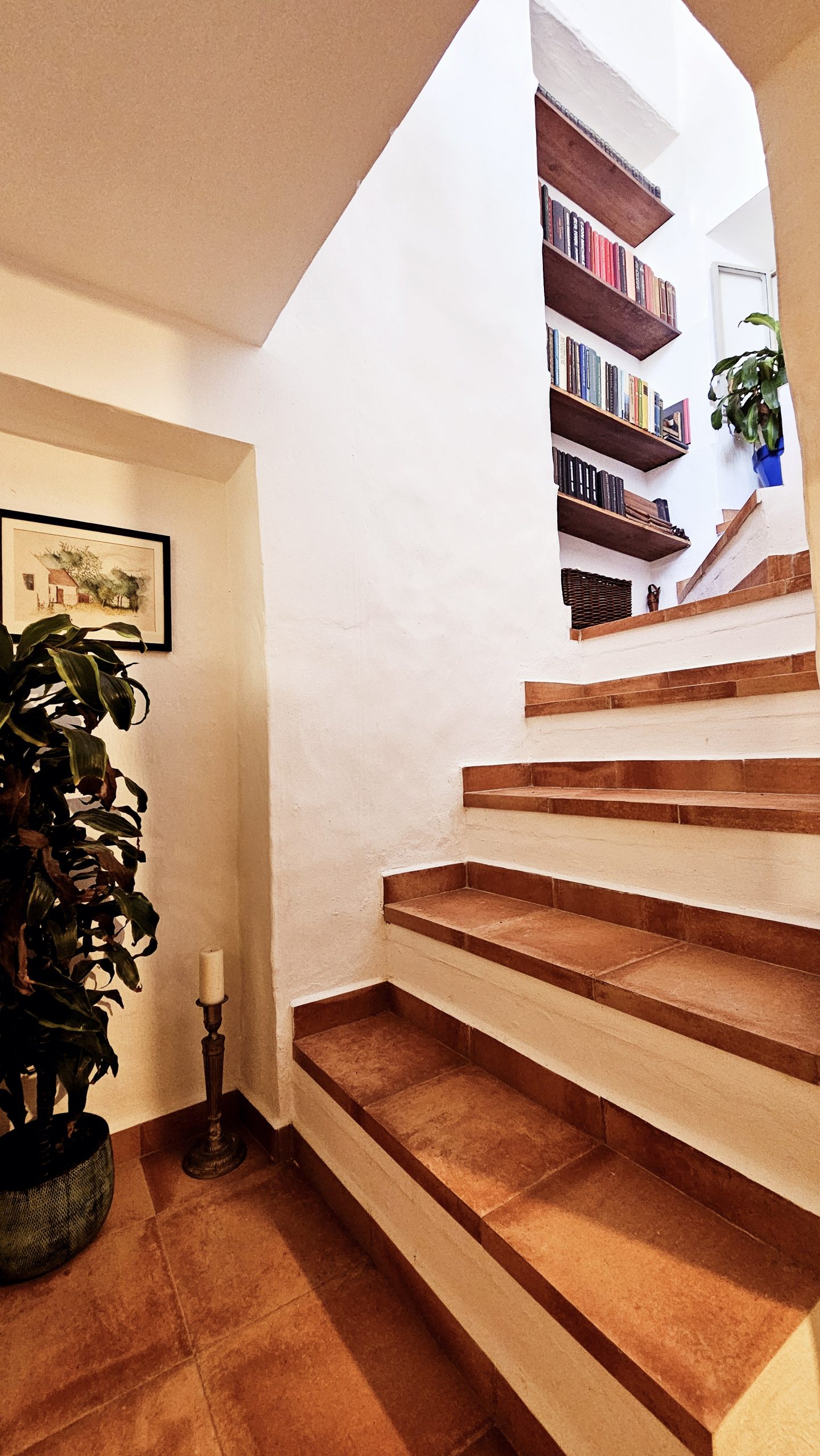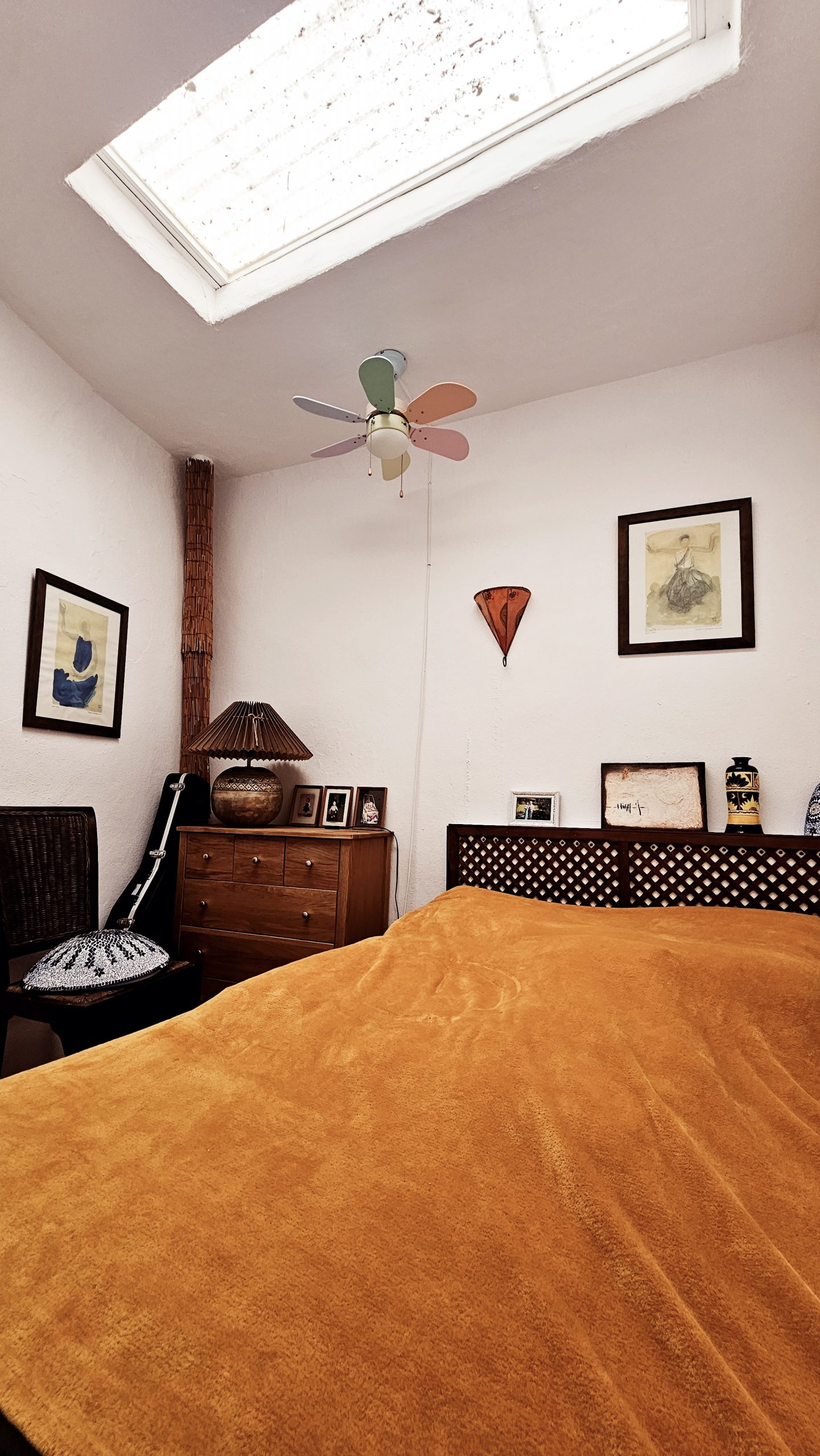 En la primera planta se encuentra un dormitorio con una claraboya que inunda el espacio de luz natural. Subiendo unos peldaños más, el dormitorio principal se convierte en un verdadero refugio, con puertas dobles que se abren a una terraza privada, perfecta para comenzar el día con un café o relajarse al atardecer.