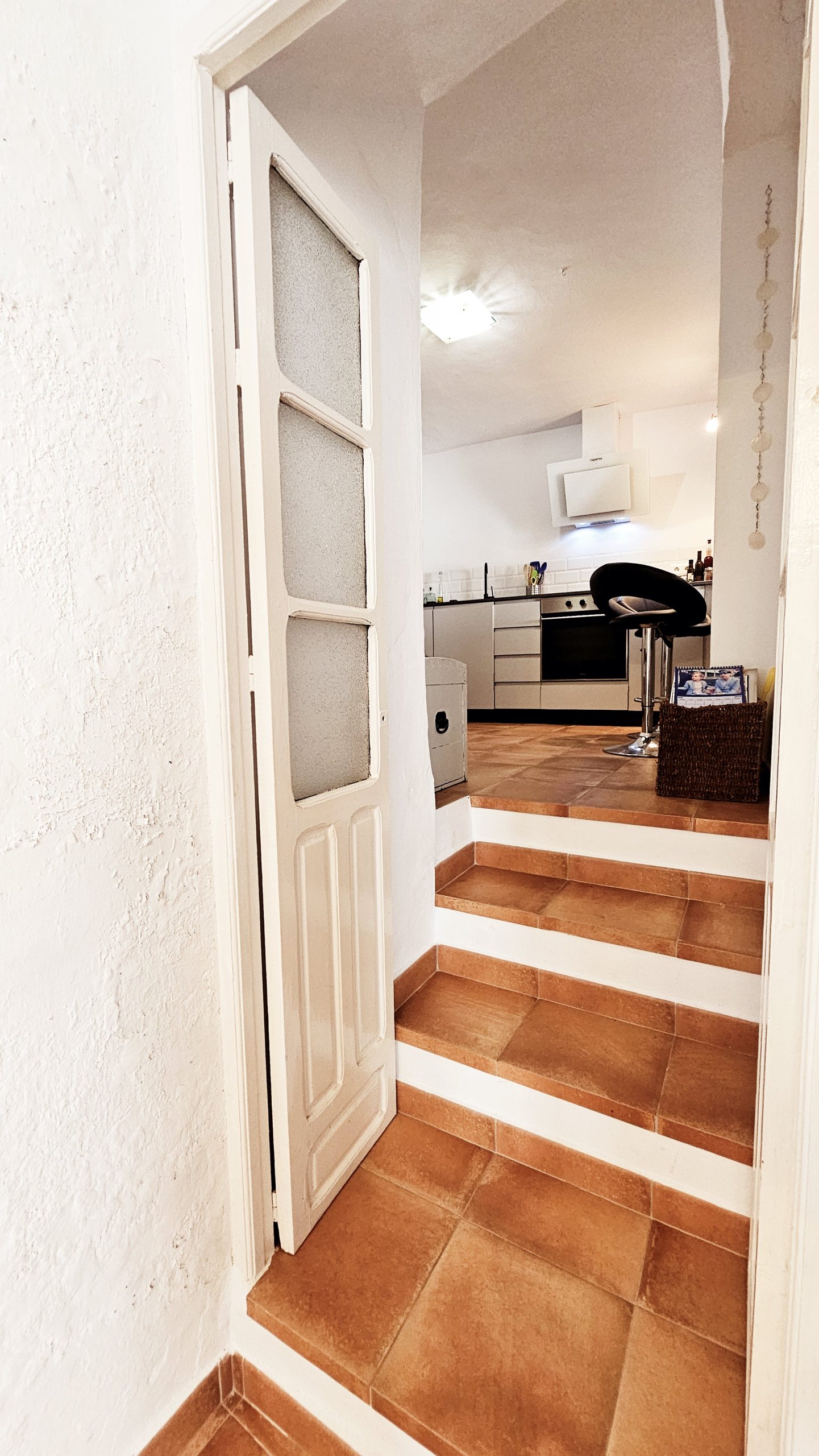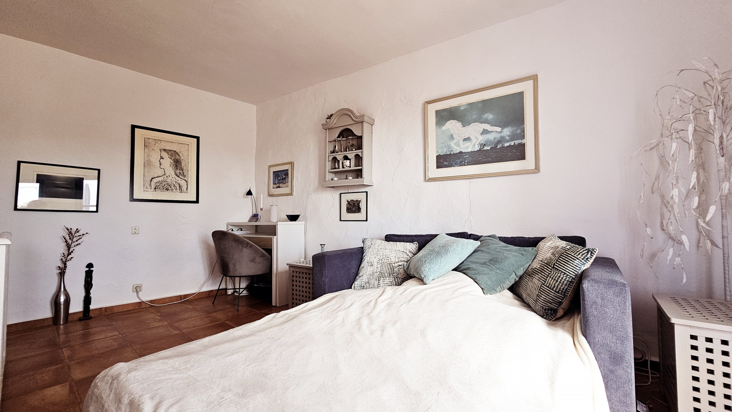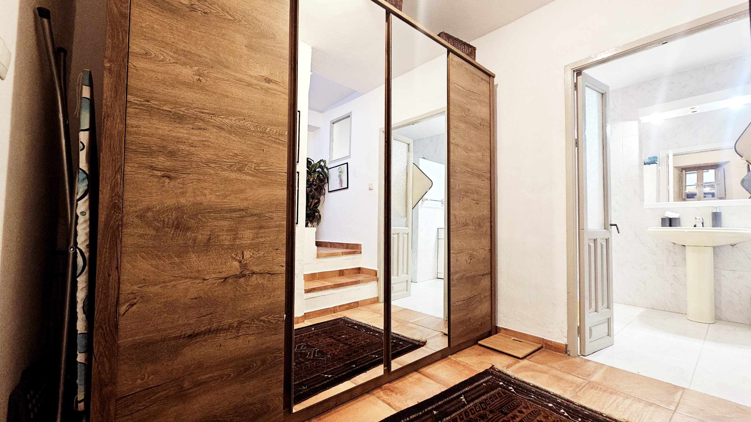 En la primera planta se encuentra un dormitorio con una claraboya que inunda el espacio de luz natural. Subiendo unos peldaños más, el dormitorio principal se convierte en un verdadero refugio, con puertas dobles que se abren a una terraza privada, perfecta para comenzar el día con un café o relajarse al atardecer.